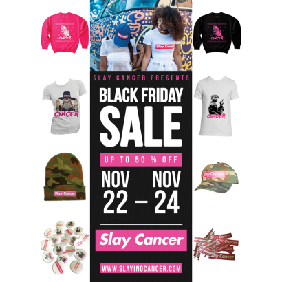 BLACK FRIDAY 2017 HAS BEEN EXTENDED!!!! Visit the shop and save UP TO 50% OFF EVERY SINGLE ITEM….YES! UP TO 50% OFF EVERY SINGLE ITEM!! SUPPORT SMALL BUSINESS AND SHOW SUPPORT FOR CANCER AWARENESS!!! SLAY CANCER MERCH IS PERFECT…