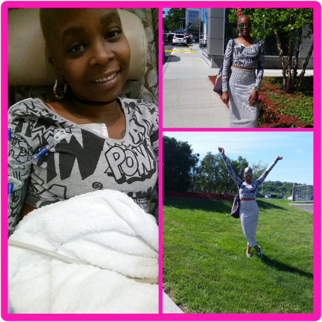 ” Today was my 2nd to last chemo treatment. WOOHOO!!!!!! Neuropathy from this damn chemo is becoming unbearable. The electric shocking feeling in my hands and feet straight startled and woke me up from the 2 hours of sleep I finally got last night smh. It was so bad, mommy had to zip the side of my skirt for me because my fingertips couldnt “feel” the zipper! WTH, how di hell am I supposed to step out and slay in these streets if I can’t even complete the final touches of the ‘fit?!?! I was thissssss close to just throwing on some sweats, and not drawing on my eyebrows but I decided to push through the pain and go for it! I took maybe 10 steps into the treatment center, and the lady that signs everyone in shouts “Deniece, don’t you look great today! Keep smiling, its contagious!” I didn’t even know I smiled bc I felt like sh*t but her comment instantly made me appreciate the fact that my smile that was hiding all the pain could actually help someone else.”